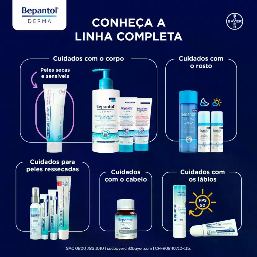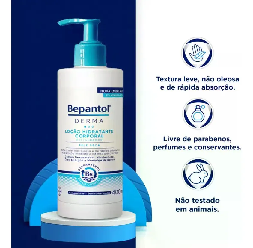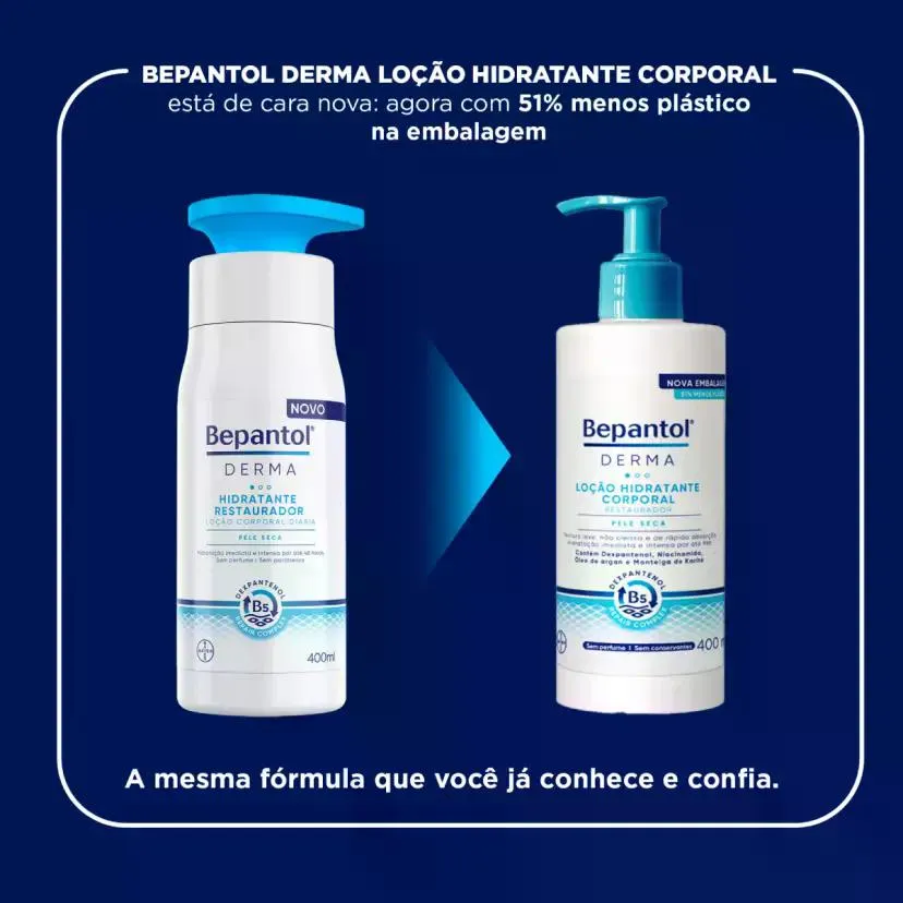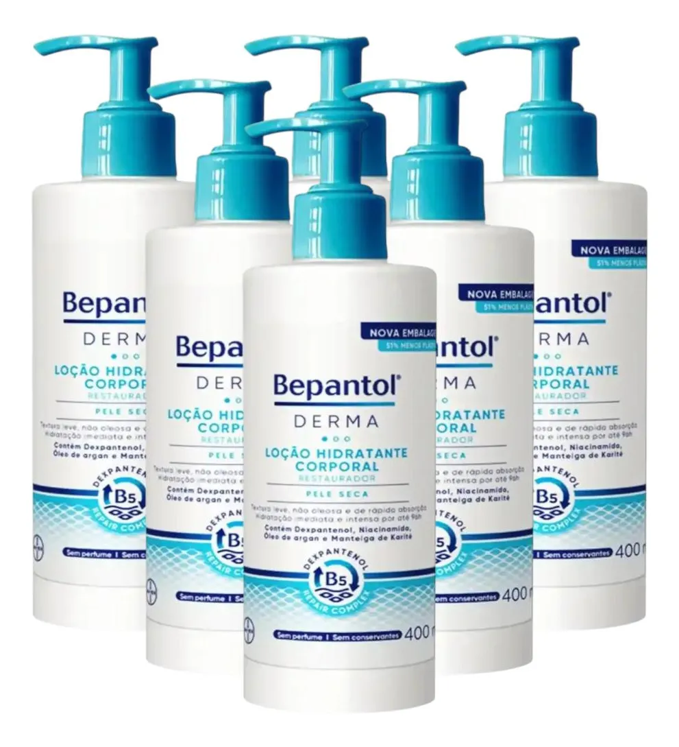 Este é um anúncio da RESILIFARMA, empresa do grupo D&F FARMA que atua há mais de 50 anos no mercado de saúde e beleza, temos 5 lojas físicas, 3 em Osasco, 1 em São Paulo e 1 em Barueri. Confira algumas vantagens de comprar na RESILIFARMA: -Temos CNPJ, somos uma empresa consolidada -Emitimos Nota Fiscal Eletrônica -Postamos sua encomenda no mesmo dia ou NO MÁXIMO no próximo dia útil Nossos horários de atendimento: -SEG A SEX das 7h00 às 17h30 LEIA COM ATENÇÃO TODO O ANÚNICIO ANTES DE FINALIZAR A COMPRA! ======================================== Kit Loção Corporal Bepantol Derma Hidratante Restaurador Com 6 Unidades De 400ml Cada ======================================== Bepantol Derma é uma loção corporal hidratante restauradora para uso diário. Indicada para pele seca e sensível, sua fórmula livre de conservantes e fragrâncias possui Niacinamida (vitamina B3), Dexpantenol B5, Glicerina e Lipídios naturais, ativos que ajudam a promover uma hidratação imediata e duradoura por até 48 horas. Tudo isso com uma textura leve, não oleosa e de rápida absorção que oferece alívio imediato para a pele ressecada. Uso externo. Não ingerir.