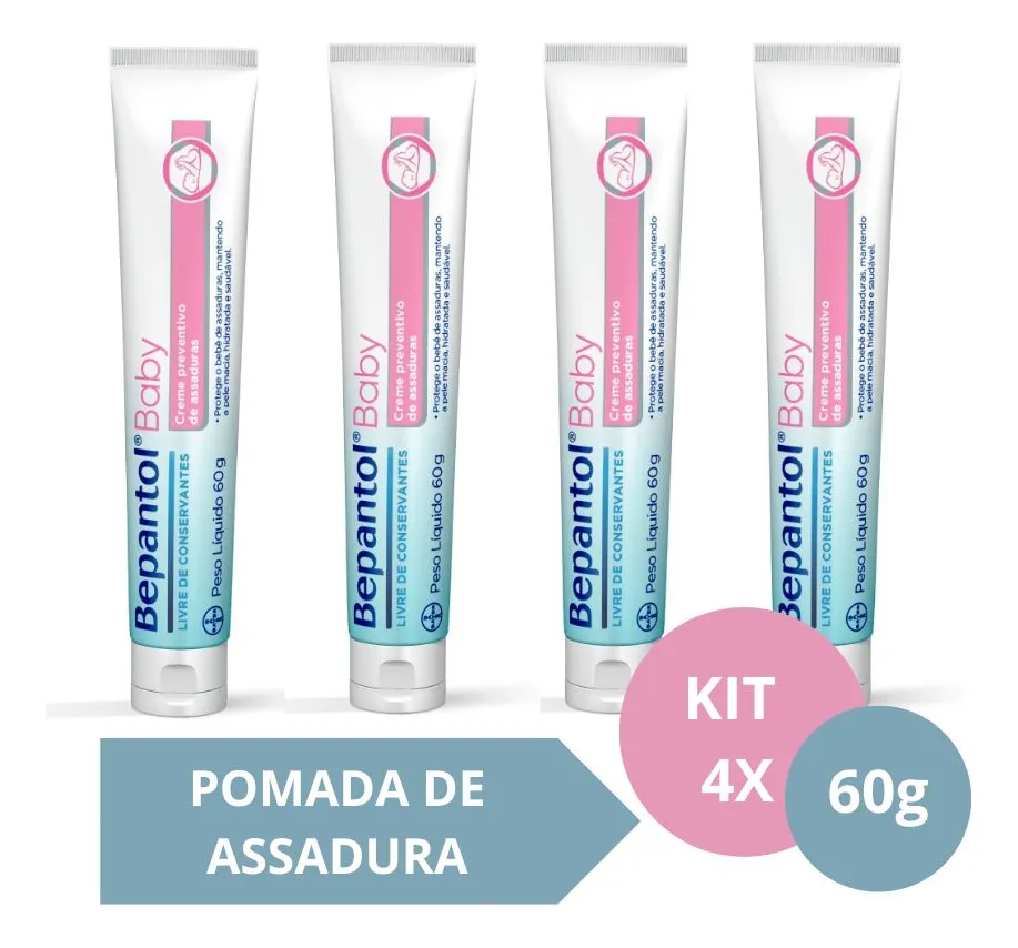 Sempre pensando no bem-estar da mãe, do pai e, claro, dos bebês, a Bayer oferece Bepantol Baby, creme anti-assaduras que vai além dos cremes comuns. Seu uso destina-se a proteger a pele das assaduras, além de mantê-la resistente, macia e hidratada. Deve ser aplicado uma camada em toda a troca de fralda. Com sua fórmula única, livre de conservantes e agentes irritantes, forma uma barreira transparente que deixa a pele delicada do seu bebê respirar, mantendo-a sempre saudável. Possui Lanolina, que forma uma barreira protetora transparente no bumbum, e pró-vitamina B5, que penetra na pele do bebê deixando-a mais resistente contra assaduras. Além disso, Bepantol Baby é uma pomada livre de perfumes, corantes e parabenos que podem sensibilizar a pele delicada do bebê. Especificações Técnicas: – Conteúdo da Embalagem: 4 Creme Pomada de Assadura Proteção Delicada 120gr cada. – Código do Fabricante: 84258547 – Marca: Bepantol * Imagens meramente ilustrativas, as cores e estampas podem variar de acordo com o lote do fabricante*
